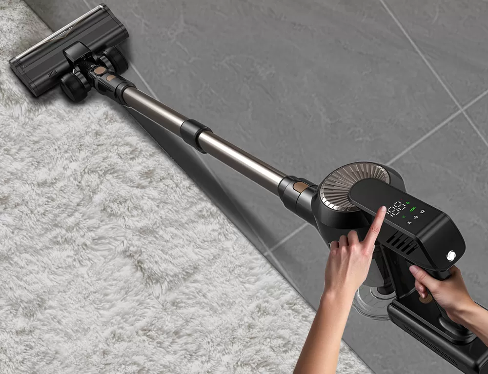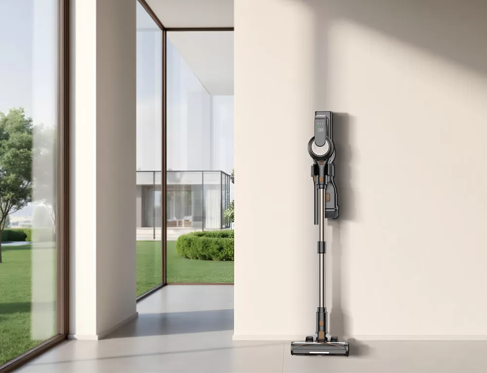 DSV820 stands upright on its own for instant, space-saving convenience. A sleek top-mounted digital display shows battery life, suction mode, and real-time status at a technologically-glance